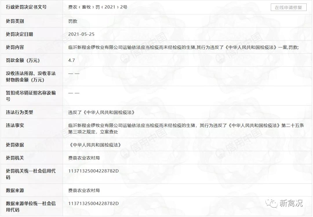 记者注意到,据信用中国,由金锣集团100%控股的临沂新程金锣牧业有限公司还曾因“运输依法应当检疫而未经检疫的生猪”,其行为违反了《中华人民共和国检疫法》第二十五条第三项之规定,被立案查处,于5月25日受到费县农业农村局的行政处罚,罚款金额为4.7万元。