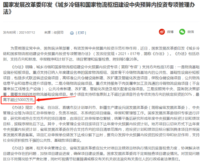 近日,发改委发布通知,重点支持服务于肉类屠宰加工及流通的冷链物流设施项目。其中规定,单个项目的支持标准原则上不超过该项目核定投资的30%,最高不超过5000万元。