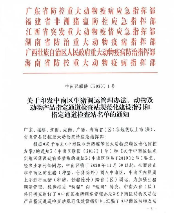 为防控非洲猪瘟,我国从2019年年初开始,就已在中南6省区试点开展分区防控,建立区域协调机制,从2019年11月30日起,除种猪、仔猪和“点对点”调运生猪外,全面禁止非中南6省(广东、福建、江西、湖南、广西和海南)的生猪(种猪、仔猪除外)调入。