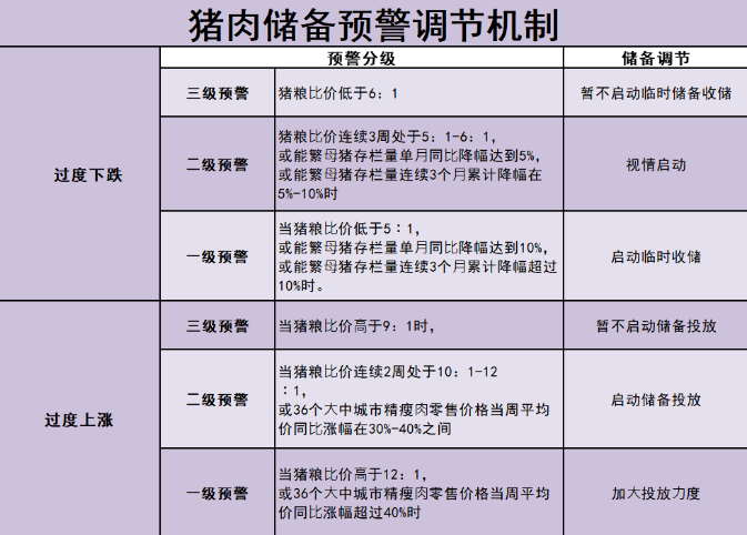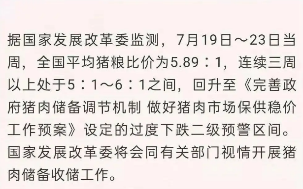 国家发改委微信公众号26日消息,据国家发展改革委监测,7月19日-23日当周,全国平均猪粮比价为5.89:1,连续三周以上处于5:1-6:1之间,回升至《完善政府猪肉储备调节机制 做好猪肉市场保供稳价工作预案》设定的过度下跌二级预警区间。国家发展改革委将会同有关部门视情开展猪肉储备收储工作。