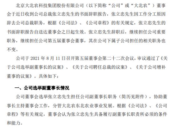 公司董事会选举张立忠担任公司副董事长职务,协助董事长主持董事会工作,分管大北农东北农业事业发展。根据《公司法》、《公司章程》等有关规定,董事会认为张立忠具备履行副董事长职责所必须的条件和能力。
