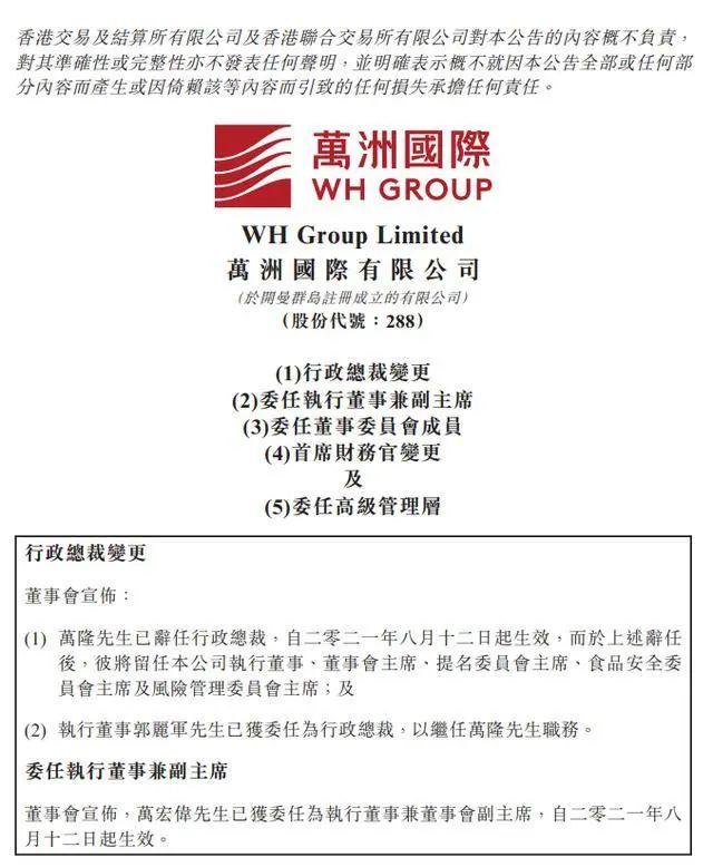 公告同时宣布,万宏伟已获委任为万洲国际执行董事兼董事会副主席,自2021年8月12日生效。现年47岁的万宏伟为万隆次子。