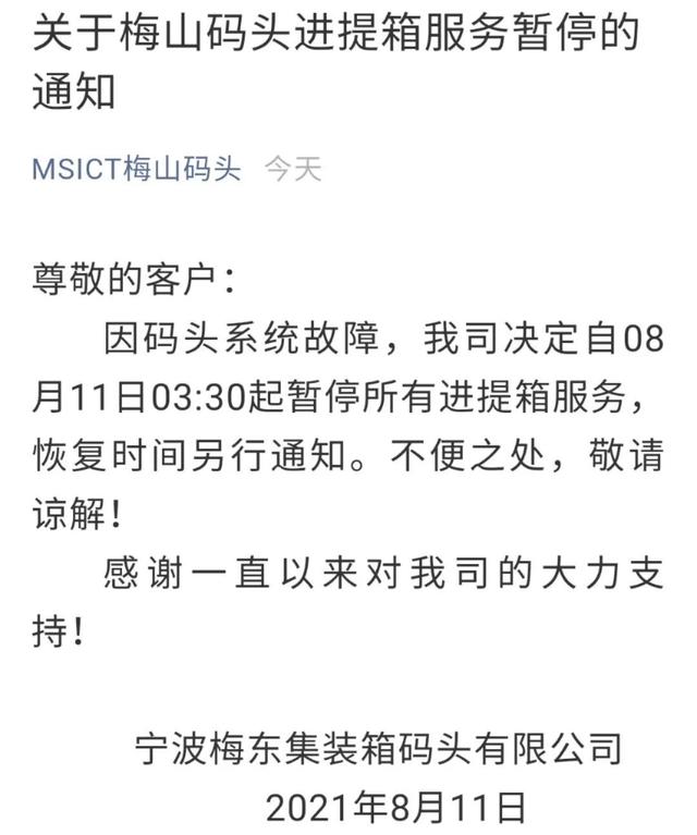 昨日凌晨,梅山码头就已宣布暂停进提箱服务,当时给出的原因是系统故障。