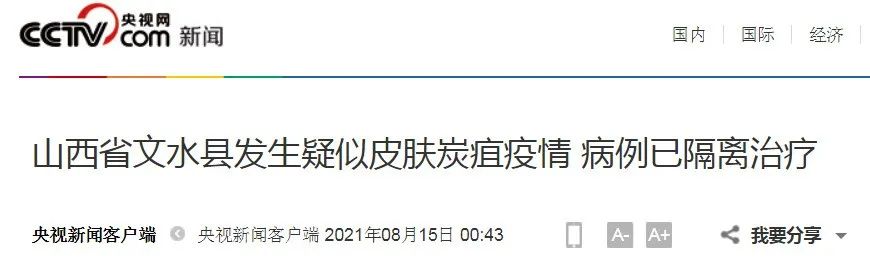 山西省卫健委消息,山西省文水县发生疑似皮肤炭疽疫情,该县刘胡兰镇中心卫生院8月12日报告,该镇保贤村近日陆续有村民出现四肢丘疹、继而变为水泡、溃破结痂变黑,且有水肿、淋巴肿等相似症状。该村有9人有上述类似症状,4人在太原治疗,其中2人已出院,目前村里还有5名患者,已隔离治疗。