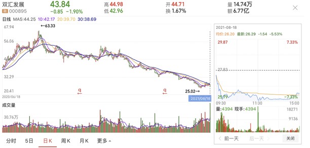 双汇发展的股价也不容乐观,截至8月18日收盘,双汇发展股价盘中下跌7%。近一年以来,双汇发展股价累计跌幅接近60%,市值蒸发近1000亿元。