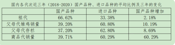 根据中国畜牧业协会统计数据,从祖代鸡来看,2006年,国产品种与进口品种分别占31%、69%;到了2020年,二者分别占66.9%、33.1%。换句话说,国产品种祖代鸡的制种能力已完全可以满足国内需求。