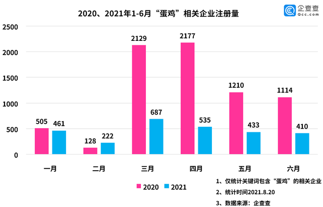 蛋价上涨受多种因素影响,由于气温较高,夏天产蛋率普遍下降5%左右,今年上半年养殖户始终处于亏损状态,这也导致了企业注册数量的下跌。企查查数据显示,2021年上半年,蛋鸡相关企业注册量为2748家,同比下降62.2%。其中,3-6月的注册量均大幅低于去年。