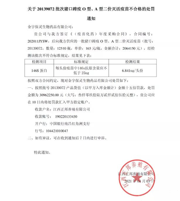 近日,一张关于正邦向金宇保灵生物开出的价值3000万的天价罚单在行业传播的沸沸扬扬,具体事件经过:网传江西正邦对金宇保灵生物开出“关于20139072批次口蹄疫O型、A型二价灭活疫苗不合格的处罚通知”,通知时间显示在8月3日。 通知显示,金宇供应的一批口蹄疫O型、A型二价灭活疫苗,经检验每头疫苗中146s抗原含量低于25μg(检测结果:6.841μg/头份),不符合标准规定。按照合同约定,正邦开出产品货值金额十五倍的罚款,处罚金额达到3096.225万元,并要求在10日内汇款到正邦指定账户!