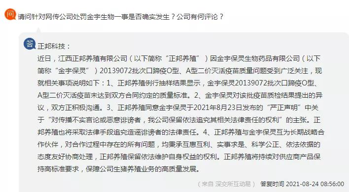 8月24日,针对近日传的沸沸扬扬的“正邦对金宇保灵开出处罚通知”一事,正邦科技在深交所互动平台上给出回应。