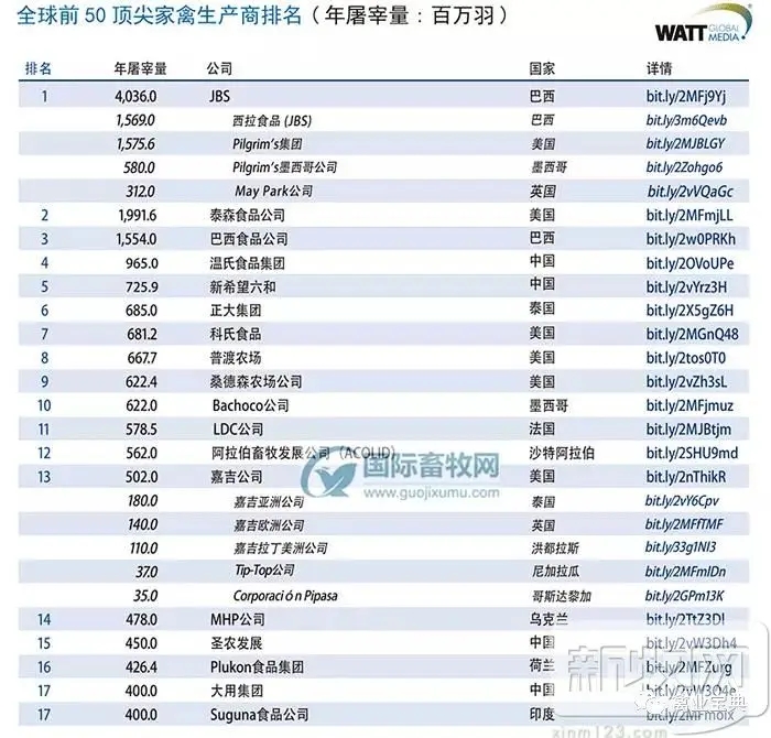 巴西JBS公司再次领先,蝉联全球最大肉鸡生产商地位。JBS每年家禽屠宰量超过40亿羽,其鸡肉业务量现在是排名第二泰森食品公司(Tyson Foods)的两倍多。