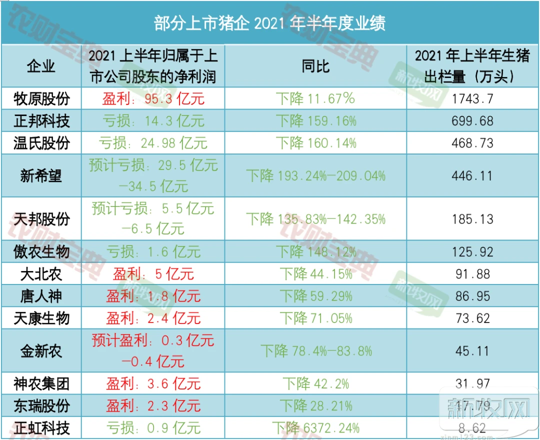 根据农财宝典新牧网记者的统计发现,13家上市猪企中,有6家直接预报亏损,而在7家保持盈利的企业中,降幅也普遍超过50%,仅有龙头老大牧原仅仅下降11%,总利润依然达到令人羡慕的95亿元。这个利润有夸张?其余6家有盈利的企业的盈利总和加起来才15.5亿元,甚至不到牧原盈利的六分之一。而6家亏损企业的亏损总和,加起来也还达不到牧原的利润。