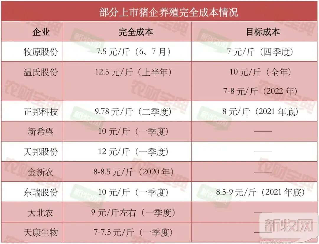 根据农财数读的统计,上市猪企公布的上半年或一季度的养殖完全成本差异巨大。牧原在投资者互动中表示:6、7月份商品猪完全成本在7.5元/斤左右;目前各区域、各子公司之间养殖成本的离散度较大,领先区域完全成本在7元/斤左右,部分场线完全成本可以达到6.5元/斤以内,部分新建设子公司成本在10元/斤左右。而部分公司+农户模式的企业一季度最高成本甚至达到15元/斤。