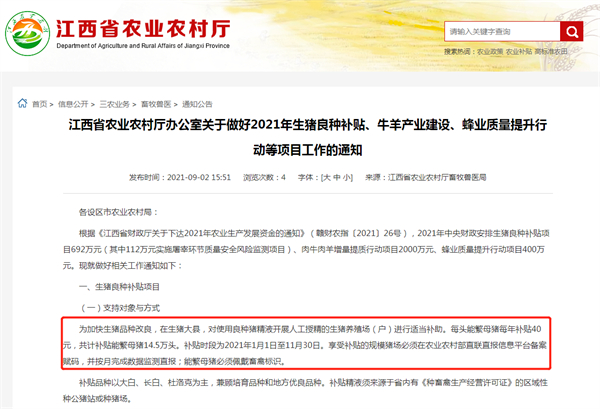 江西省农业农村厅办公室发布关于做好2021年生猪良种补贴通知