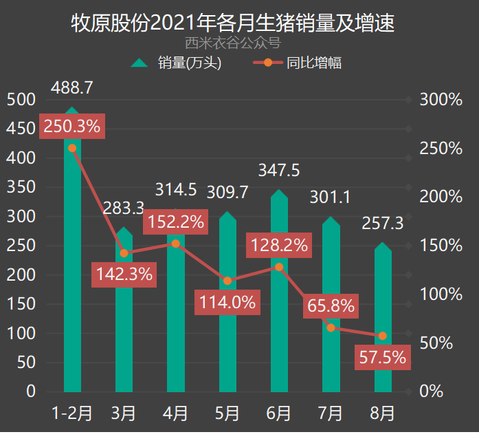 2021年8月,公司销售生猪257.3万头,同比增57.5%。公司2021年以来各月生猪销量如下: