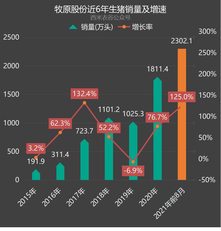 2021年前八月,公司共销售生猪2,302.0万头,同比大增125.0%。公司近六年及2021年前八月生猪销售情况如下:
