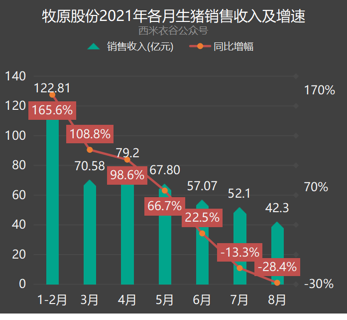 2021年8月,公司生猪销售收入42.34亿元,同比下滑28.4%。公司2021年以来各月生猪销售收入如下: