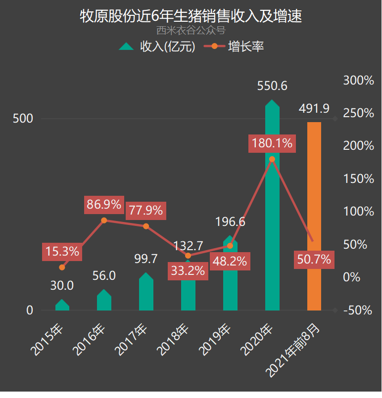 前八月,公司生猪销售收入491.90亿元,同比增50.7%。近六年及2021年前八月生猪销售收入如下: