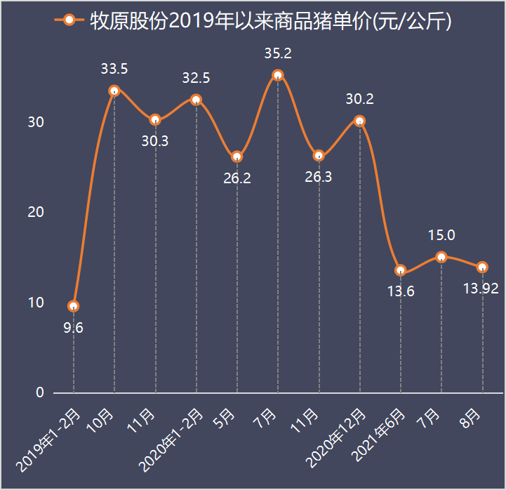 2021年8月,公司商品猪销售均价13.92元/公斤。2019年1月以来,公司商品猪销售均价如下: