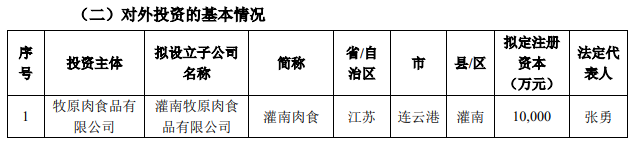 公司子公司牧原肉食品有限公司以自有资金出资设立灌南牧原肉食品有限公司,拟定注册资本10,000万元,经营范围为生猪收购、屠宰;分割肉产品加工、定制肉产品加工;肉产品开发、销售;热加工熟肉制品、发酵肉品、预制调理肉制品、腌腊肉制品、速冻肉制品的开发、生产、销售等。