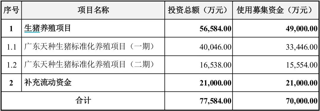 不过,其中金新农用于补充流动资金仅2.1亿元,意味着剩余资金全部用于生猪补栏。公司上述项目的投资总额为7.8亿,超过了此次募集资金总额。