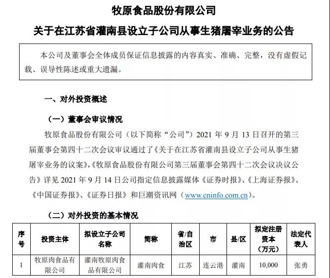 而牧原股份则是新设立子公司,涉及屠宰业务。根据公司9月13日公告,以自有资金出资灌南牧原肉食品有限公司,注册资本1亿元。牧原股份表示,公司由养殖环节向下游发展的重要举措。