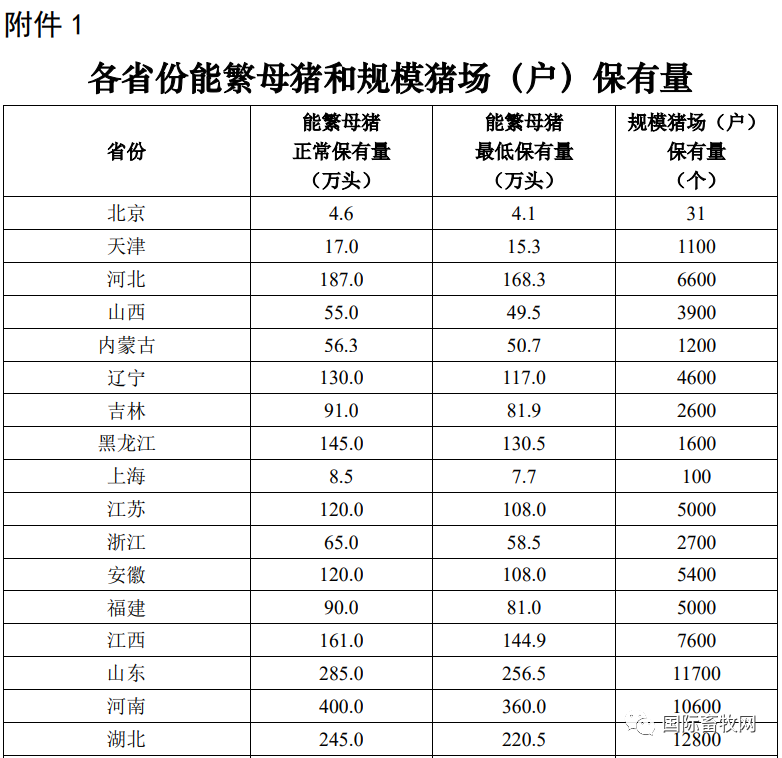 各省(自治区、直辖市)和新疆生产建设兵团(以下简称“各省份”)能繁母猪保有量的确定方式:以《农业农村部关于印发2020—2021年生猪稳产保供任务目标的通知》(农牧发〔2020〕11号)中各省份2021年生猪存栏目标的10%为基础,结合各地生产实际,确定能繁母猪正常保有量;以能繁母猪正常保有量的90%为标准,确定最低保有量(见附件1)。各省份能繁母猪月度存栏量以国家统计局季度数据为基数,根据农业农村部监测数据测算得出。