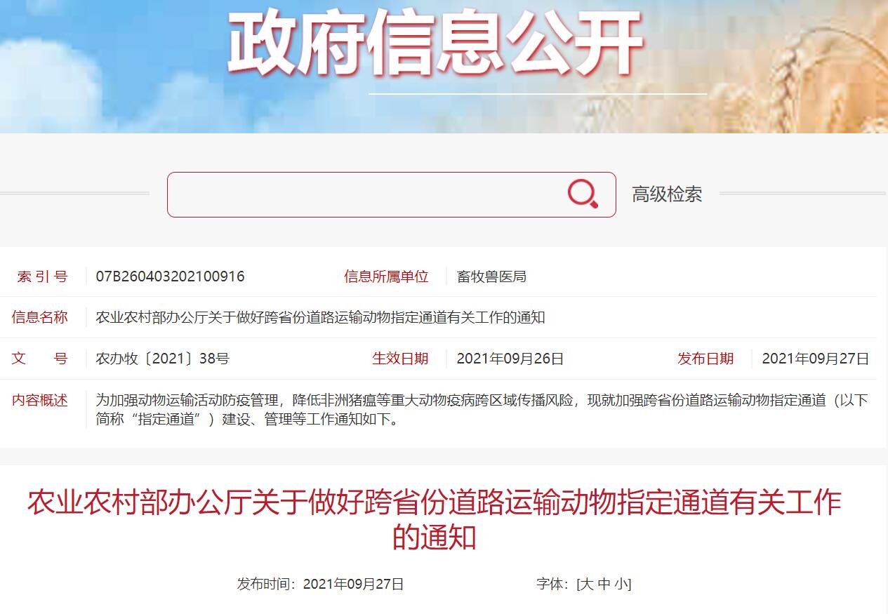 为深入贯彻落实《中华人民共和国动物防疫法》、《国务院办公厅关于加强非洲猪瘟防控工作的意见》(国办发〔2019〕31号)、《国务院办公厅关于促进畜牧业高质量发展的意见》(国办发〔2020〕31号)有关要求,加强动物运输活动防疫管理,降低非洲猪瘟等重大动物疫病跨区域传播风险,现就加强跨省份道路运输动物指定通道(以下简称“指定通道”)建设、管理等工作通知如下。