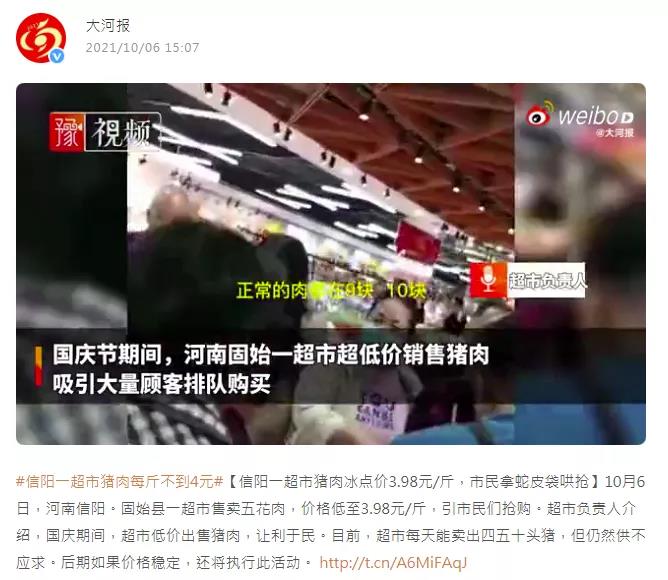 10月6日大河报新浪微博号消息,河南信阳固始县一超市售卖五花肉,价格低至3.98元/斤,顾客排长队购买。现场画面中可以看到,排队的顾客大部分都是中老年人,但也有不少年轻人,他们有的带着编织袋,有的直接带着箩筐到超市抢购。