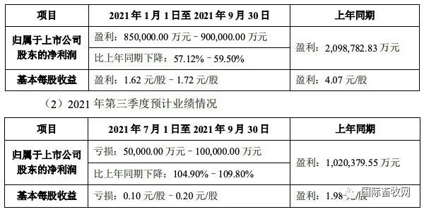 10月14日,牧原股份发布2021年度前三季度业绩预告,预计第三季度亏损5亿元-10亿元,上年同期盈利10.2亿元,同比下降104.90%–109.80%。