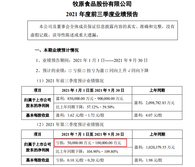 牧原股份预计,公司第三季度净利亏损5亿元-10亿元,而上年同期盈利102.04亿元;2021年前三季度,公司预计盈利85亿元–90亿元,同比下降57.12%–59.50%。牧原股份表示,报告期内公司生猪出栏量较去年同期大幅增加,但由于国内生猪产能逐渐恢复,2021年前三季度生猪价格较去年同期明显下降,导致公司2021年前三季度经营业绩较去年同期明显下降。