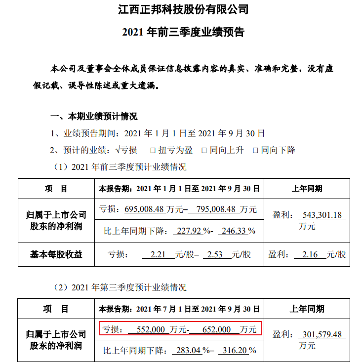 10月14日晚间,正邦科技发布业绩预告,预计第三季度亏损55.2亿元-65.2亿元,而上年同期盈利30.16亿元。公司预计前三季度合计亏损69.5亿元–79.5亿元,上年同期盈利54.33亿元。报告期末,该公司根据市场行情及实际业务情况计提了存货跌价准备,共计约12.22亿元。公司称,由于国内生猪市场价格大幅下滑对公司生产经营业绩造成较大影响,导致业绩承压。