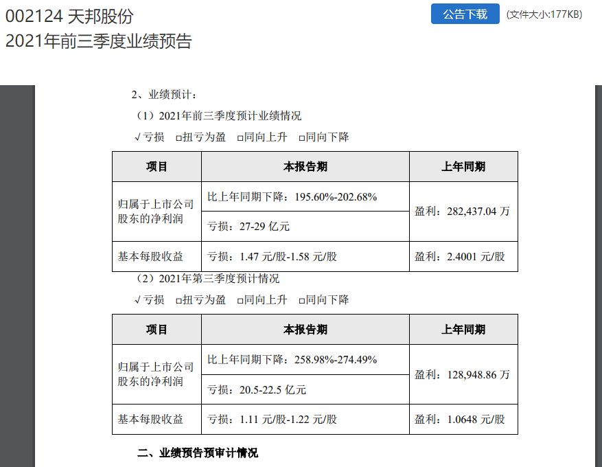 当晚,天邦股份也预计,公司第三季度将亏损20.5亿元-22.5亿元,而上年同期盈利12.89亿元。预计前三季度合计亏损27亿元-29亿元,上年同期盈利28.24亿元。
