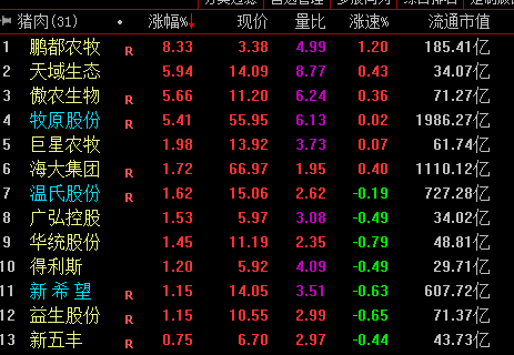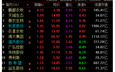 10月15日早盘,猪肉股涨势明显。截至发稿,鹏都农牧涨8.33%,牧原股份涨5.4%,温氏股份、新希望均涨超1%。