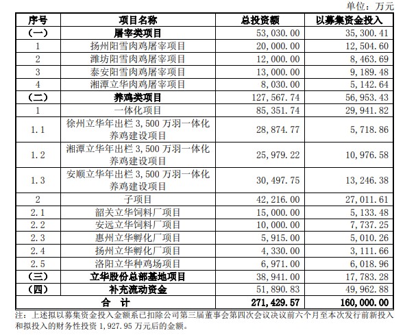根据公告显示,本次发行股票的募集资金,在扣除发行费用后依旧用于屠宰类项目、养鸡类项目、总部基地项目及补充流动资金。