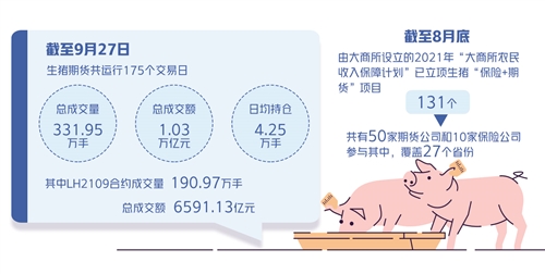 该负责人表示,在市场各方努力下,首批生猪交割在9月顺畅完成,生猪期货交易、交割、风险控制等各项制度得到了实践检验。记者了解到,自今年生猪期货在大商所上市后,生猪“保险+期货”项目的效果显著,为中小企业、养殖户提供了生猪价格风险保障。截至8月底,由大商所设立的2021年“大商所农民收入保障计划”已立项131个生猪“保险+期货”项目,共有50家期货公司和10家保险公司参与其中,覆盖27个省份,保障生猪数量136万头,已产生赔付项目21个,最高赔付率达405%,扶持资金达7369.45万元。