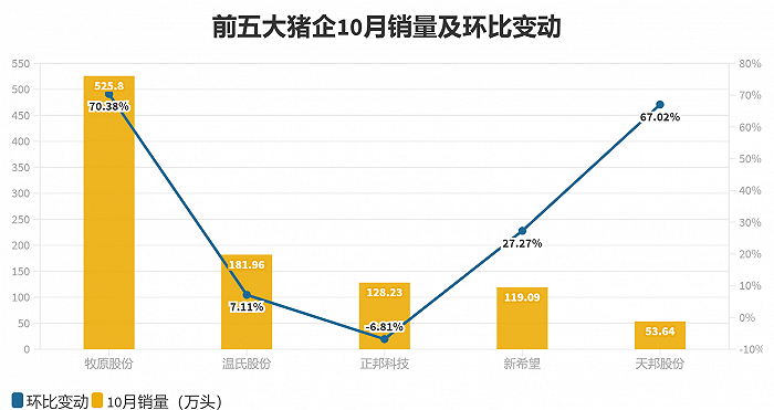 从出栏量来看,除正邦科技销量有所下滑外,其余四家头部猪企10月销量环比均不同程度增长。其中,牧原股份生猪销量环比大增逾7成后,单月生猪出栏量创新高,首次超过500万头。天邦股份、新希望、温氏股份在销量上也分别实现67.02%、27.27%、7.11%的环比增幅。