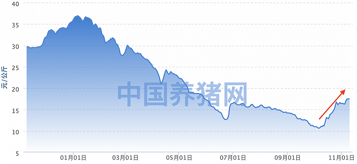 而这一涨势也延续至11月份。中国养猪网数据显示,生猪(外三元)、生猪(内三元)目前均价分别为17.57元/公斤、17.42元/公斤,价格较11月1日分别上涨了1.16元/公斤、1.26元/公斤;生猪(土杂猪)目前价格为16.93元/公斤,较11月1日上涨1.11元/公斤。