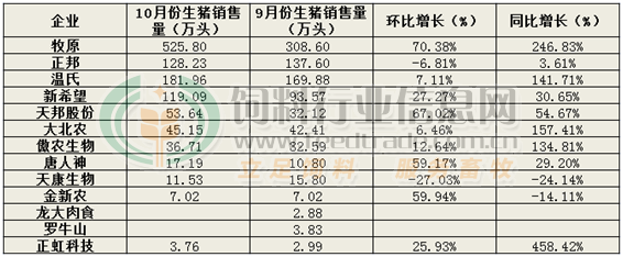 在猪价大幅回涨后,企业生猪出栏量再创新高,目前已公布10月份销售业绩的11家生猪养殖企业出栏量破千万,总量高达1130万头左右,环比9月份的860万头增长270万头。