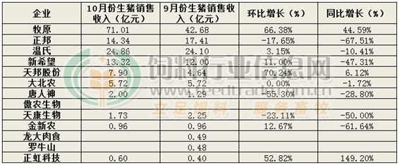 10月份除正邦、唐人神、天康生物销售收入环比下降外,其余大部分企业销售收入环比增长。其中牧原销售收入高达71.01亿元,环比增长高达66.38%,远超其他养殖企业;天邦股份销售收入增长也比较明显,环比9月份增长70.24%,两家企业销售收入增长明显与生猪销量大增脱不了干系。
