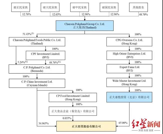 正大集团主要股东为泰国著名的“谢氏家族”,由谢正民、谢大民、谢中民、谢国民四兄弟家族组成,也是多年的泰国首富家族,持股比例分别为12.76%、12.63%、12.96%和 12.96%。虽然四人系兄弟关系,但四家族之间不存在一致行动关系,且正大集团任一股东持有或控制的股份比例均不超过13%。
