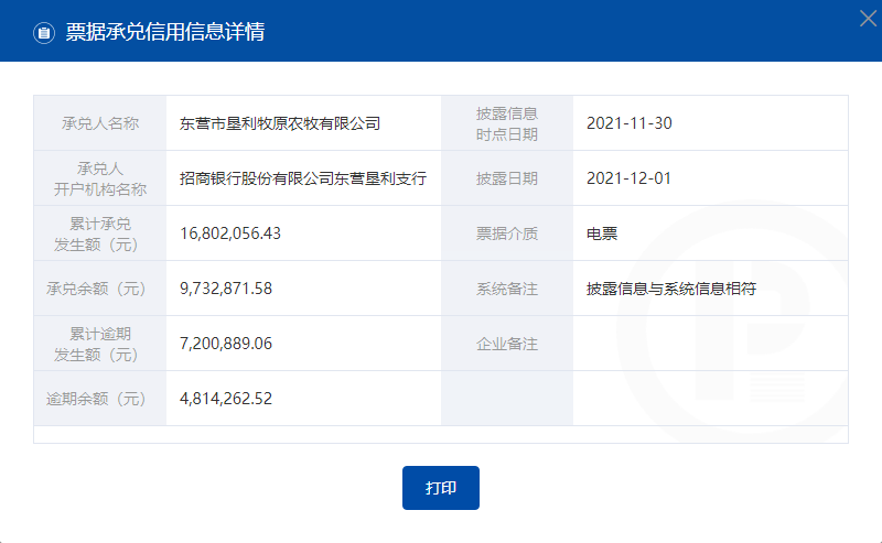 以逾期余额较多的东营市垦利牧原农牧有限公司为例,上海票据交易所披露的信息显示,该公司10月份并未逾期,到了11月份,逾期余额达到481.43万元,累计逾期发生额为720.09万元。