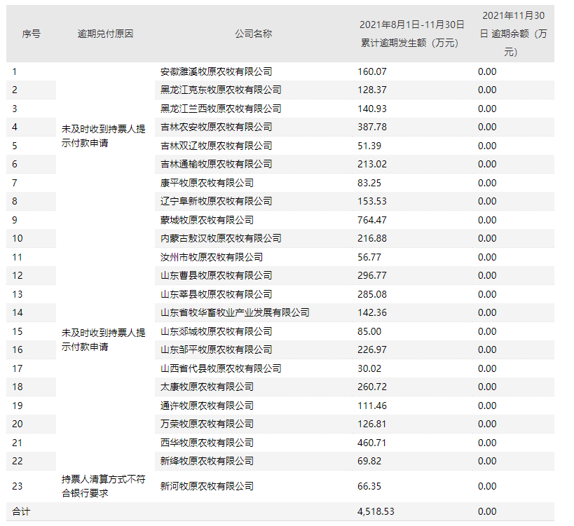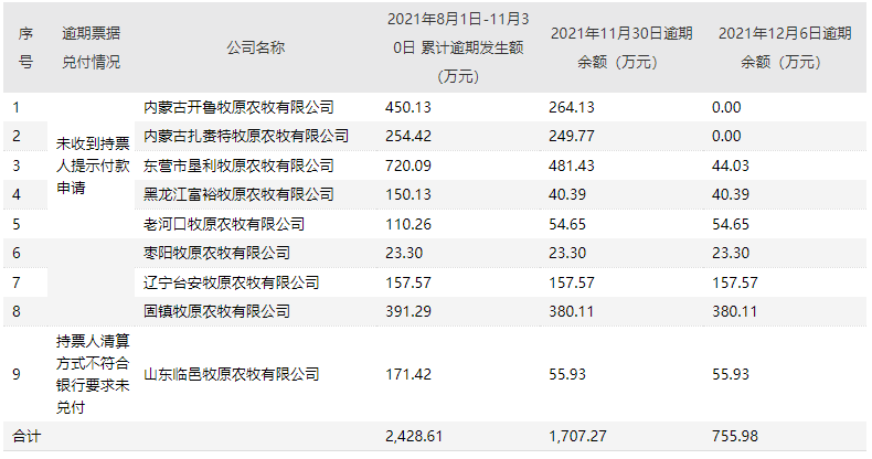 12月6日晚间,牧原股份公告,2021年8月1日至11月30日,公司共有32家子公司出现付款逾期。经公司核查,截至2021年11月30日,其中23家子公司已完成全部逾期商票的兑付。截至2021年11月30日,公司尚有9家子公司存在逾期未支付商业承兑汇票合计1707.27万元;截至2021年12月6日,公司9家子公司尚存逾期未支付商业承兑汇票合计755.98万元。