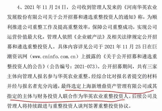 3、公开招募期间,共有三家主体向管理人报名参与华英农业重整。公告显示,经综合比对报名者提交的材料并经与报名者充分沟通,最终选定上海新增鼎资产管理有限公司(以下简称“新增鼎”)或其指定的主体与财务投资人联合作为华英农业重整投资人。