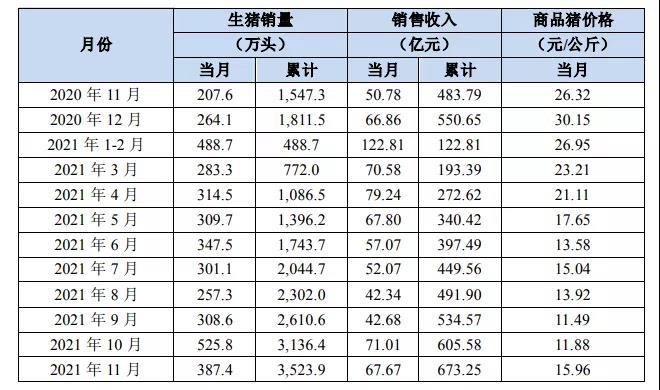 2021年1-11月累计商品猪销量141.71万头,同比上升64.1%;销售收入23.39亿元,同比上升2.3%。2021年11月公司生猪销量同比下降的主要原因是仔猪销量大幅减少,环比下降的主要原因是公司对生产经营计划进行调整。