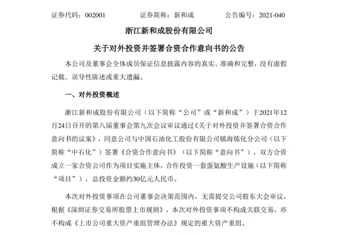 12月26日晚间,新和成发布公告,将与中石化镇海炼化分公司签署《合资合作意向书》,双方合资成立公司,合作投资一套蛋氨酸生产设施,总投资金额约30亿元。