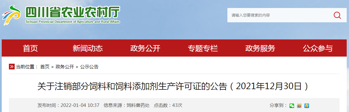 中国质量新闻网讯 2022年1月4日,四川省农业农村厅网站发布关于注销部分饲料和饲料添加剂生产许可证的公告(2021年12月30日)。