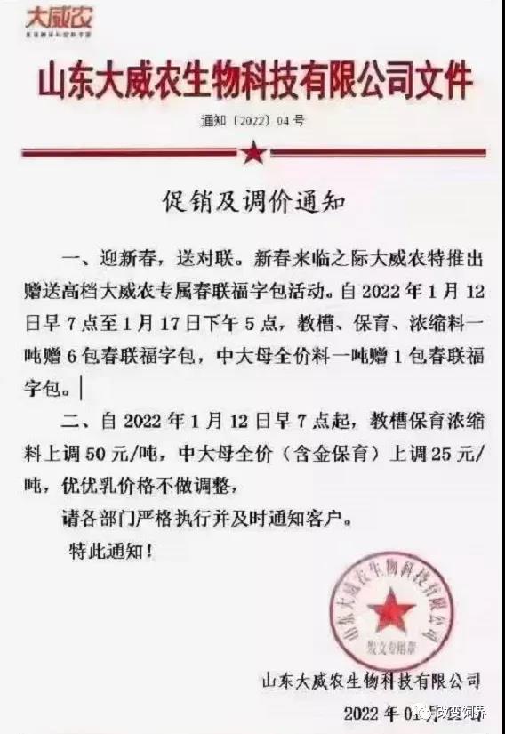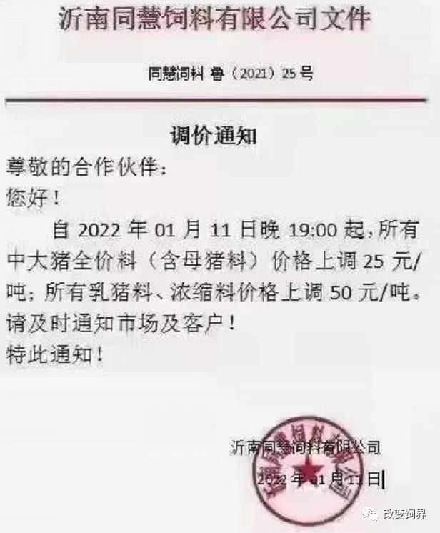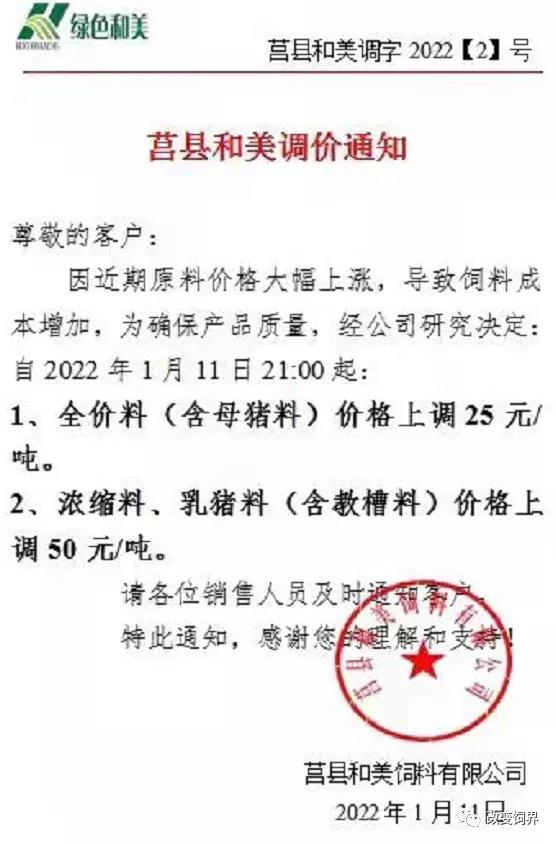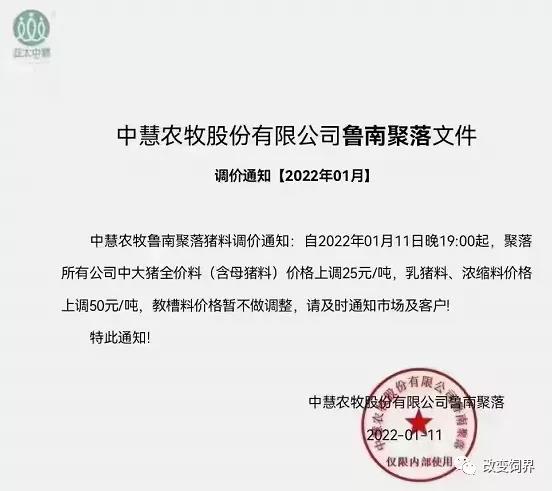 中慧农牧鲁南聚落猪料调价通知:自2022年01月11日晚19:00起,聚落所有公司中大猪全价料(含母猪料)价格上调25元/吨,乳猪料、浓缩料价格上调50元/吨,请及时通知市场及客户!