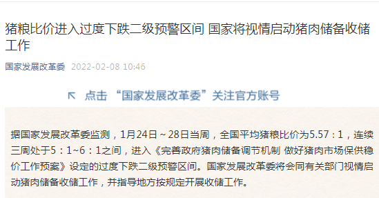 据国家发改委官方微信2月8日消息,据国家发展改革委监测,1月24日~28日当周,全国平均猪粮比价为5.57∶1,连续三周处于5:1~6:1之间,进入《完善政府猪肉储备调节机制 做好猪肉市场保供稳价工作预案》设定的过度下跌二级预警区间。国家发展改革委将会同有关部门视情启动猪肉储备收储工作,并指导地方按规定开展收储工作。