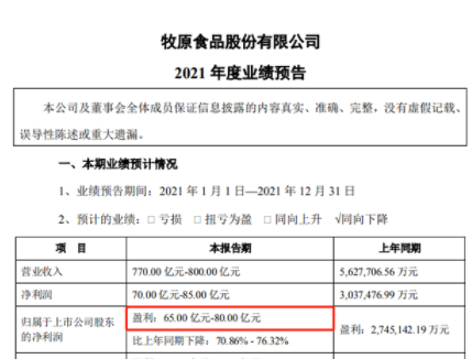 2021年“猪茅”牧原股份预计实现归母净利润65亿元-80亿元,是为数不多还能够盈利的龙头猪企。然而公司净利也同比大幅下滑70%以上。