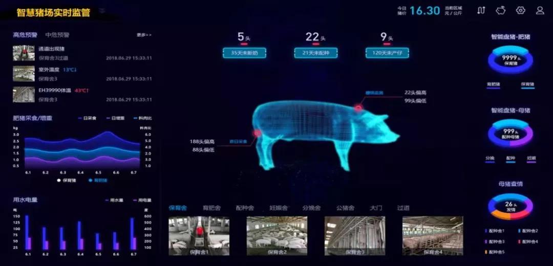 正邦构建了云边端一体化设备物联网设备运维管理体系,智能设备运维监控大数据平台,各类先进设备进驻猪场,完成猪场智能化改造升级。一是所有新建场、技改场,全部导入智能供料系统,实现自动化料塔称重、自动化料线打料,精准饲喂器根据猪只不同种类、不同日龄饲喂程序自动下水下料,实现智能化喂猪。二是建立猪场智能环控系统,该系统可根据猪舍内部环境温度、湿度、二氧化碳浓度、氨气浓度自动变频控制风机转速,确保常年猪舍内部的恒温控制,满足猪只最佳生产环境需求。三是建立猪场智能防非系统,对人员、物资、车辆、猪只进行全流程的防控,通过智能硬件从物理层面阻断非瘟传播途径,关键环节采用数字化非瘟检测技术,结果直接管控流程运行,整个猪场防非过程实现可视化监控。未来,通过智能化技术赋能,正邦将实现育肥人均饲养量从2000头提升到3000头,进一步提升养殖效能,助力降本增效。